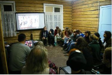Am späten Nachmittag ging es dann in einer großen Diskussionsrunde mit allen Teilnehmern um das Thema 70 Jahre Kriegsende und Symbole der Erinnerung. Als Einstieg werden drei Briefe aus dem Buch „die letzten Briefe aus Stalingrad“ auf deutsch und russisch vorgelesen. In der dann folgenden ausführlichen Diskussion über persönliche Berührungspunkte zum Krieg, über Vorurteile, über Gedenken, über Patriotismus etc wurde deutlich, dass der Umgang mit dem Gedenken und Erinnern an den 2. Weltkrieg sowohl auf russischer und deutscher Seite, als auch zwischen den jeweiligen Generationen, recht unterschiedlich ist. Unseren deutschen Jugendlichen ist dabei u.a. die mit dem Thema verbundene besondere Emotionalität der etwas älteren russischen Generation deutlich geworden. Als Abschluss der Diskussionsrunde wird uns in einem kurzen Film die relativ neue Erinnerungsbewegung in Russland vermittelt: hunderttausende von Menschen auf der Straße mit Fotos von Weltkriegsopfern.
