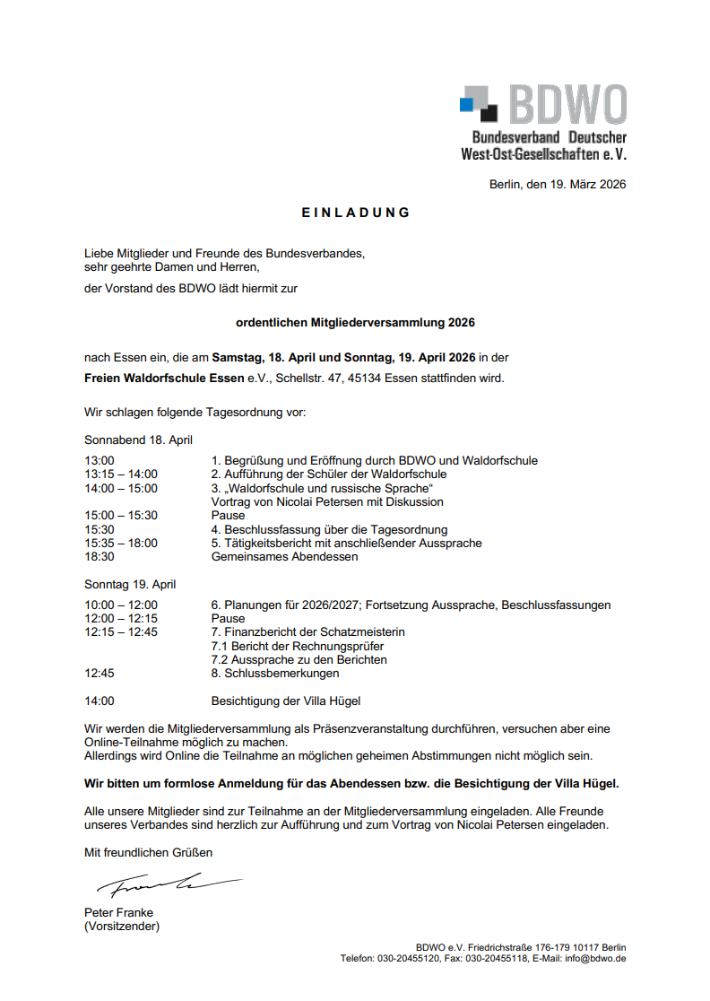 Einladung zur Mitgliederversammlung des BDWO (Bundesverband Deutscher West-Ost-Gesellschaften e.V) am 18./19. April in der Waldorfschule in Essen